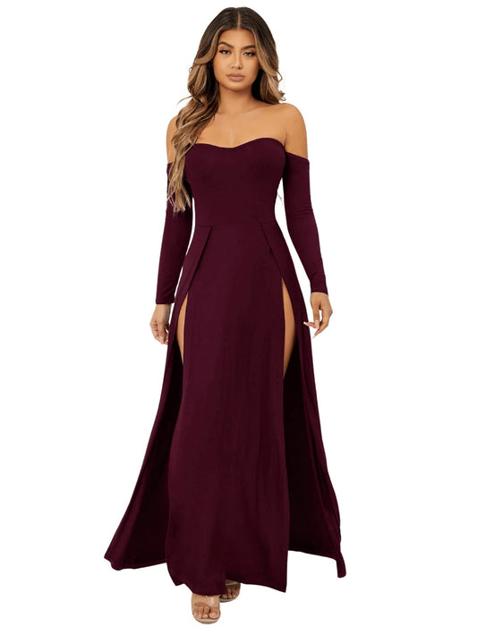 Elegant Off Shoulder Double High Slit Long Sleeve Dress A Line Maxi Dresses