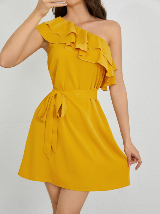 One Shoulder Tiered Layered Sleeveless Ruffle Trim Tunic Dress