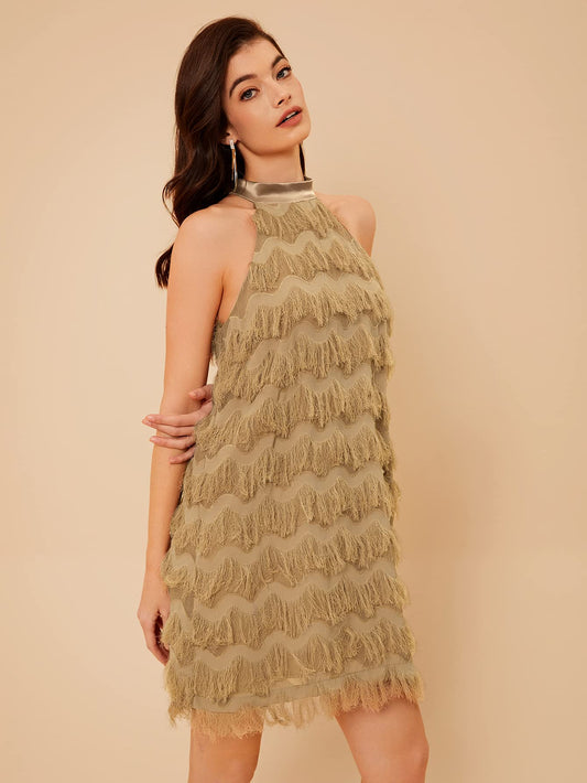 Fringe Trim Halter Sleeveless Party Straight Short Dress
