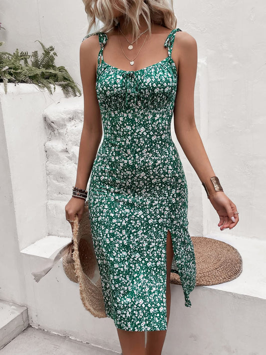 Floral Print Tie Shoulder Split Thigh Sleeveless Boho Cami Dress