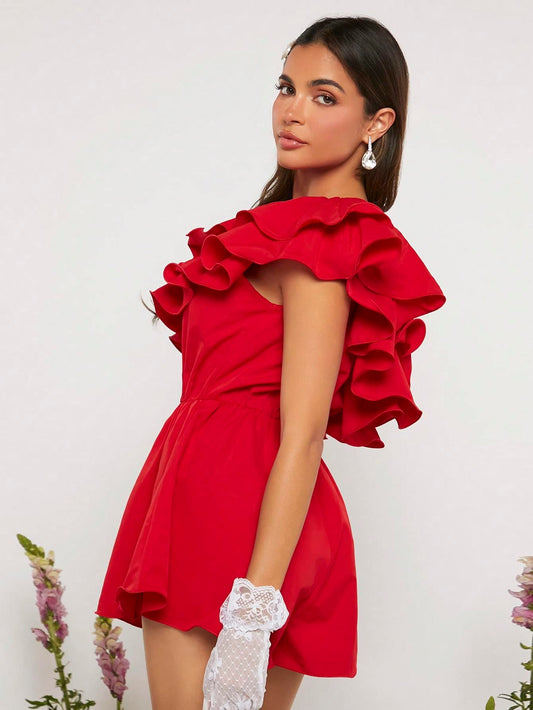 One Shoulder Layered Ruffle Trim Sleeveless Party Romper Shorts Jumpsuits