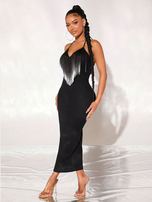 Fringe Trim Split Backless Halter Neck Sleeveless Party Bodycon Maxi Dress