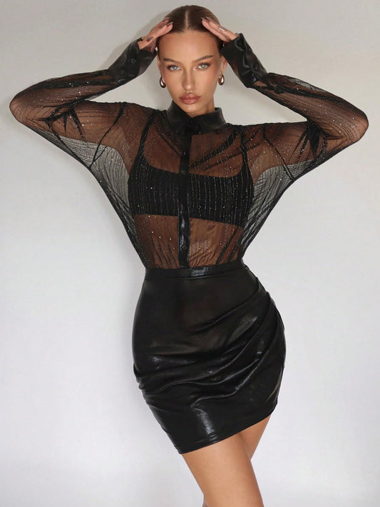 Glitter Mesh Sheer Button Front Long Sleeve See Through Sexy Bodycon Party Mini Dress